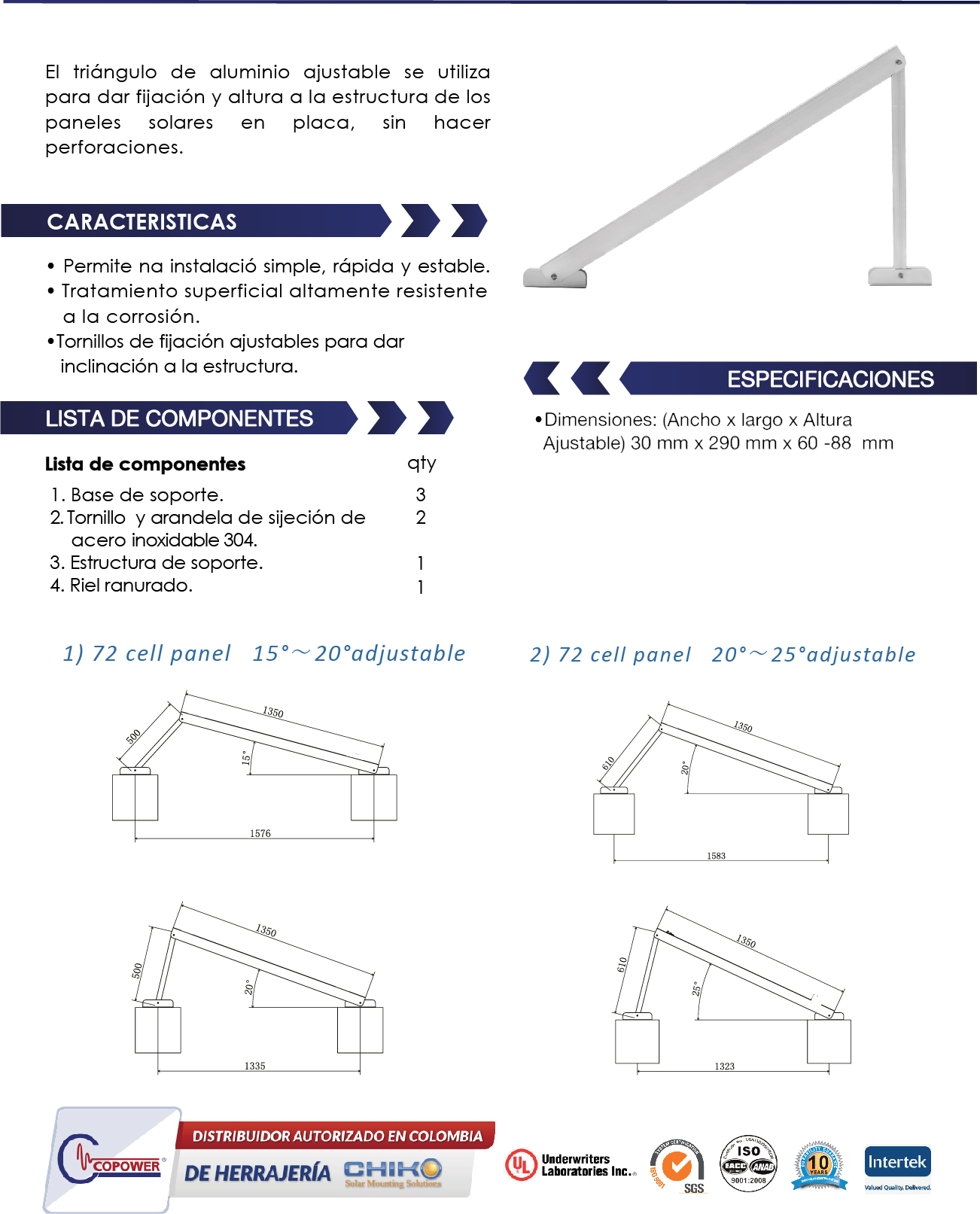 El triángulo de aluminio ajustable se utiliza para dar fijación y altura a la estructura de los paneles solares en placa, sin hacer perforaciones.