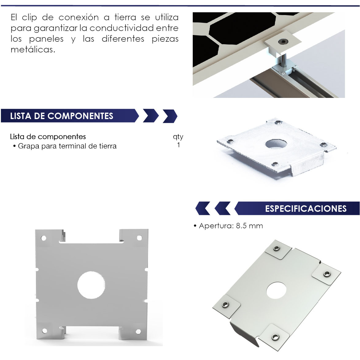 El clip de conexión a tierra se utiliza para garantizar la conductividad entre los paneles y las diferentes piezas metálicas del sistema.