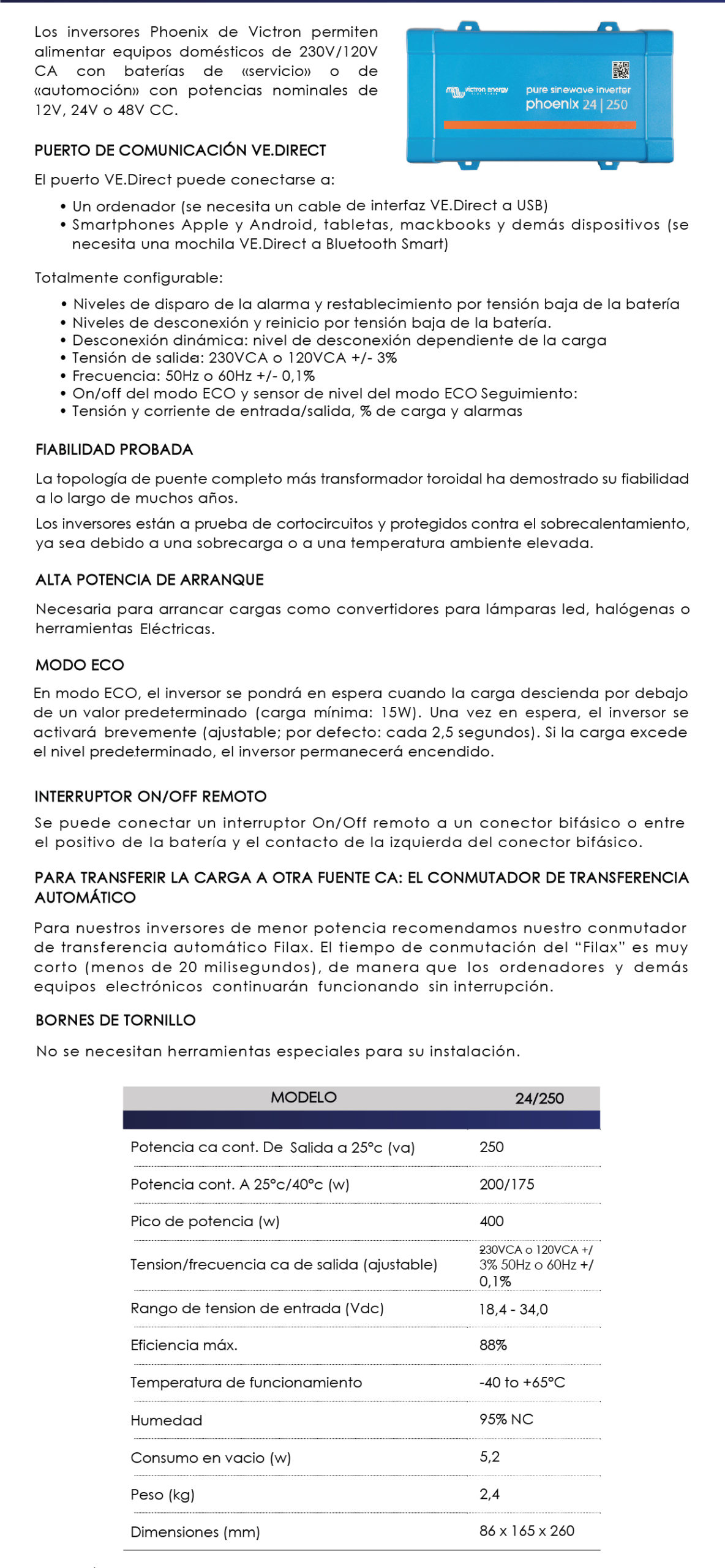 INVERSOR OFF GRID VICTRON ENERGY | PHOENIX INVERTER 24/250 120V VE.Direct NEMA 5-15R