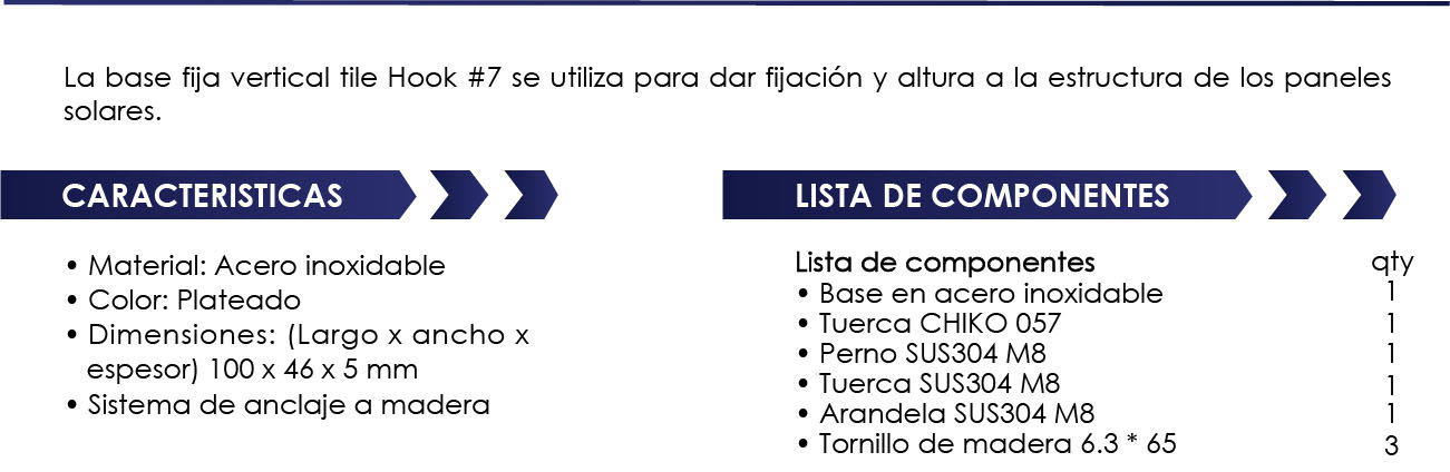 La base fija vertical tile Hook #7 se utiliza para dar fijación y altura a las estructuras de los paneles solares.