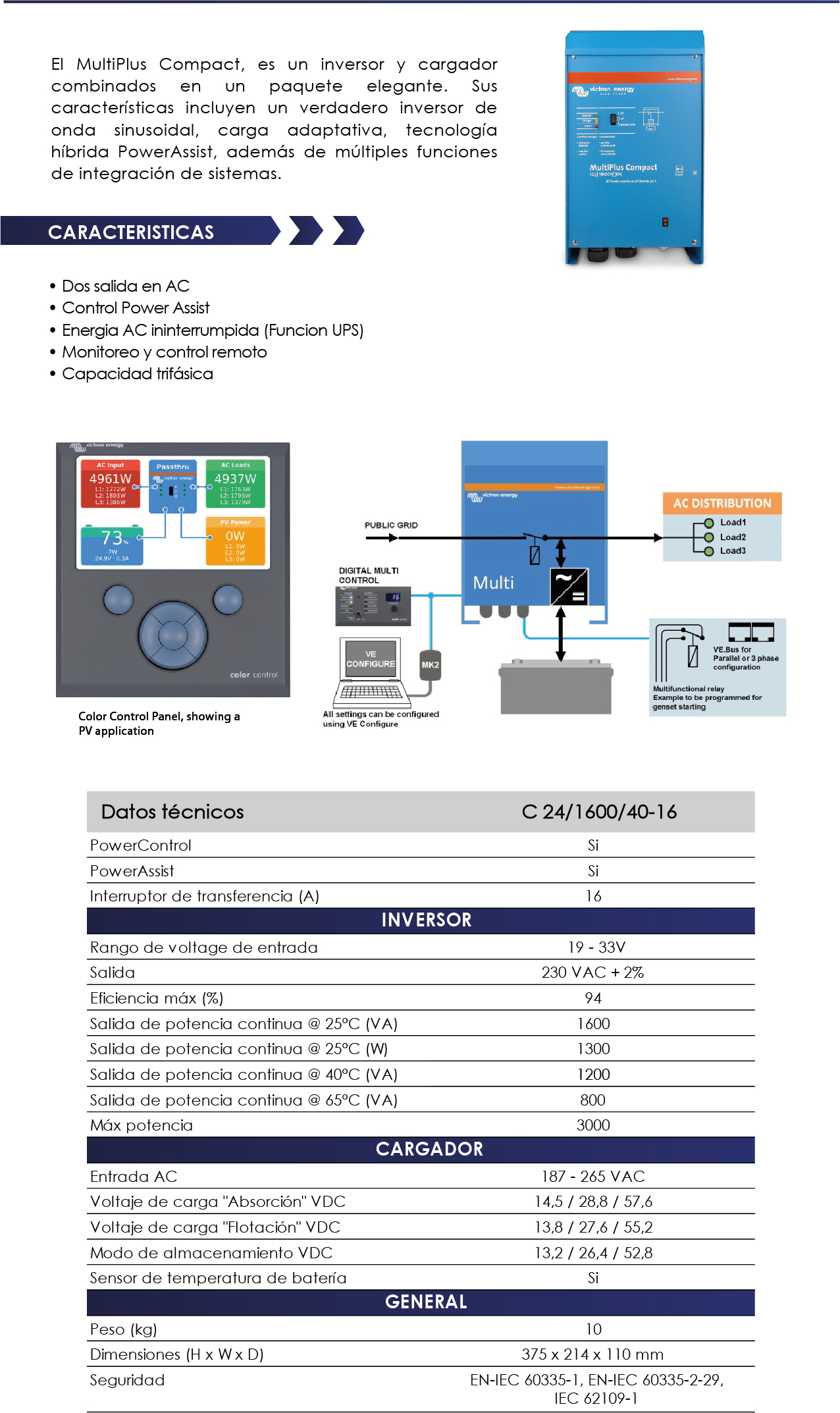 El MultiPlus Compact, es un inversor y cargador combinados en un paquete elegante. Sus características incluyen un verdadero inversor de onda sinusoidal, carga adaptativa, tecnología híbrida PowerAssist, además de múltiples funciones de integración de sistemas.